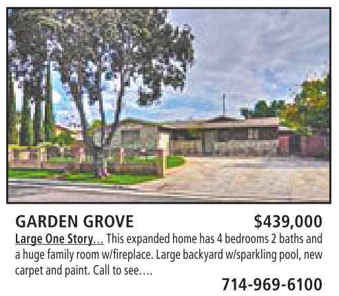 GARDEN GROVE $439,000 Large OneStory…This expandedhome has4bedrooms 2baths and ahugefamilyroomw/fireplace. Large backyard w/sparklingpool, new carpet andpaint. Call to see….