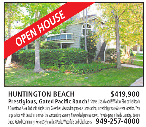 HUNTINGTON BEACH $419,900 Prestigious, GatedPacificRanch! ShowsLikeaModel!!Walk or Biketothe Beach &DowntownArea. Endunit,single story, Greenbeltviewswithgorgeous landscaping. Incredibly private &serene location. Two large patios with beautifulviewsofthe surrounding scenery. Newerdual pane windows. Private garage, Inside Laundry. Secure Guard-Gated Community, ResortStyle with 3Pools,Waterfalls and Clubhouses. 949-257-4000