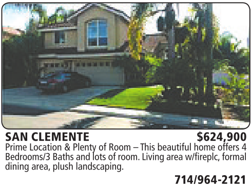 SAN CLEMENTE $624,900 Prime Location &Plenty of Room –This beautiful home offers 4 Bedrooms/3 Bathsand lots of room. Living area w/fireplc, formal dining area,plush landscaping.