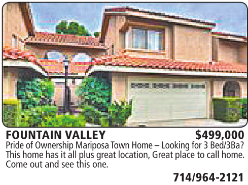 FOUNTAIN VALLEY $499,000 Pride of Ownership Mariposa Town Home –Looking for 3Bed/3Ba? This home has it all plus great location, Great place to call home. Come outand see this one.