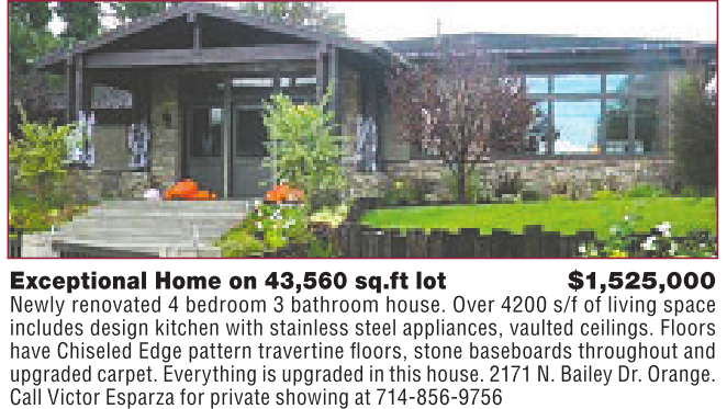 Exceptional Home on 43,560 sq.ft lot $1,525,000 Newly renovated 4 bedroom 3 bathroom house. Over 4200 s/f of living space includes design kitchen with stainless steel appliances, vaulted ceilings. Floors have Chiseled Edge pattern travertine floors, stone baseboards throughout and upgraded carpet.Everythingisupgradedinthishouse.2171N.Bailey Dr.Orange. Call Victor Esparzafor privateshowing at 714-856-9756