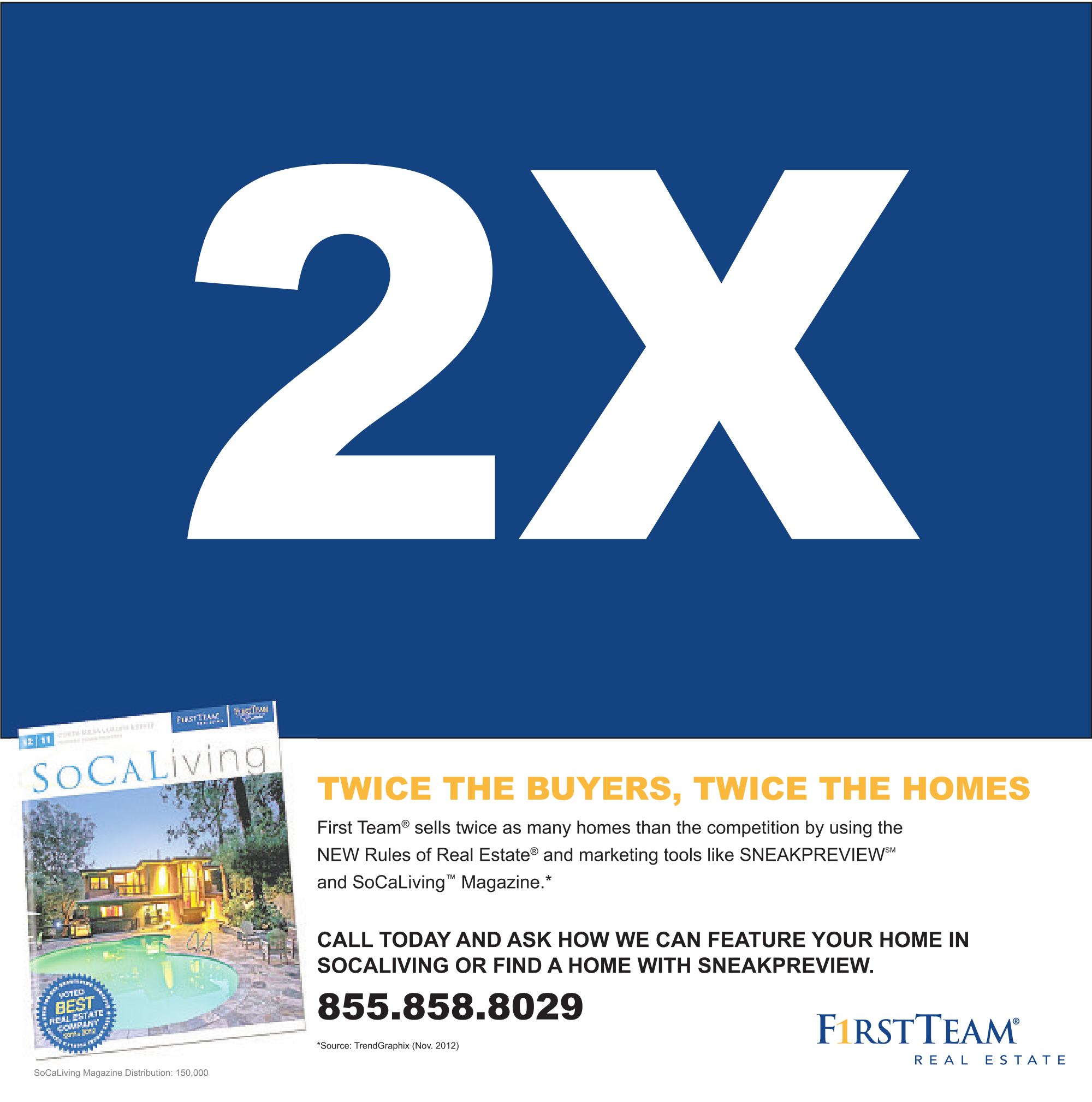2X TWICE THE BUYERS, TWICE THE HOMES First Team ® sells twice as many homes than the competition by using the NEW Rules of Real Estate ® and marketing tools like SNEAKPREVIEW SM and SoCaLiving ™ Magazine.* CALL TODAY AND ASK HOW WE CAN FEATURE YOUR HOME IN SOCALIVING OR FIND A HOME WITH SNEAKPREVIEW. 855.858.8029 *Source: TrendGraphix (Nov. 2012) SoCaLiving Magazine Distribution: 150,000