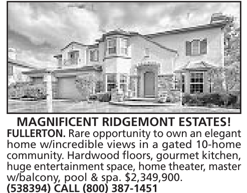 MAGNIFICENT RIDGEMONT ESTATES! FULLERTON. Rare opportunity to own an elegant home w/incredible views in a gated 10-home community.Hardwood floors, gourmet kitchen, huge entertainment space, home theater,master w/balcony, pool & spa. $2,349,900. (538394) CALL (800) 387-1451
