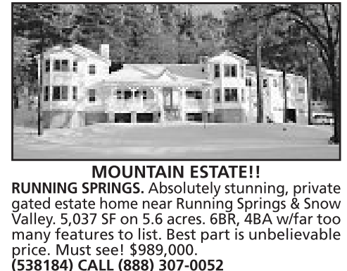 MOUNTAIN ESTATE!! RUNNING SPRINGS. Absolutely stunning, private gated estate home near Running Springs &Snow Valley.5,037 SF on 5.6 acres. 6BR, 4BA w/far too many features to list. Best part is unbelievable price. Must see! $989,000. (538184) CALL (888) 307-0052