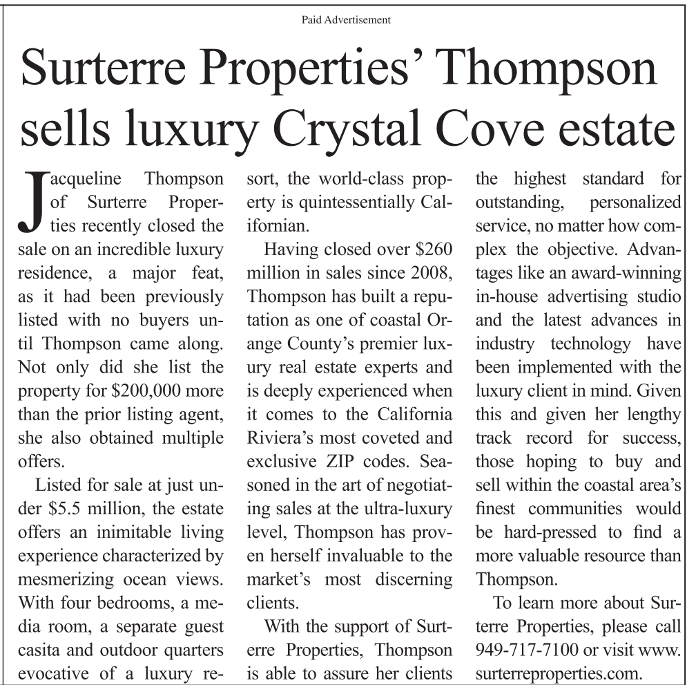 Surterre Properties’ Thompson sells luxury Crystal Cove estate