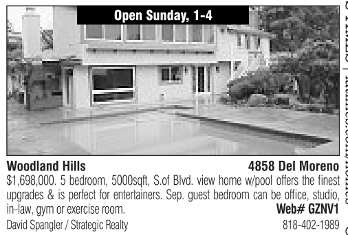 Woodland Hills Open Sunday, 1-4 4858 Del Moreno $1,698,000. 5bedroom, 5000sqft, S.of Blvd. view home w/pool offers the finest upgrades &isperfect for entertainers. Sep. guest bedroom can be office, studio, in-law, gym or exercise room. Web# GZNV1 David Spangler /Strategic Realty 818-402-1989