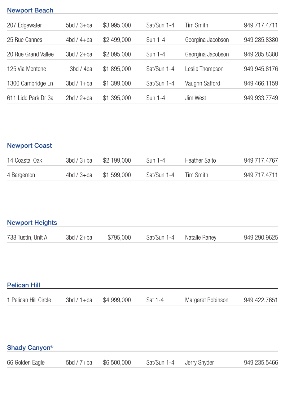 1Pelican Hill Circle 3bd /1+ba $4,999,000 Sat 1-4 Margaret Robinson 949.422.7651