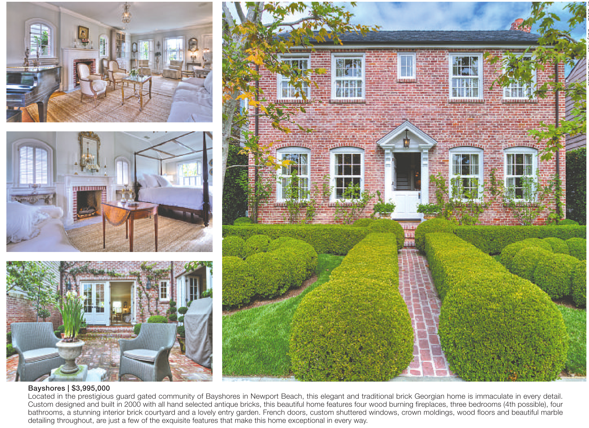 Bayshores | $3,995,000 Located in the prestigious guard gated community of Bayshores in Newport Beach, this elegant and traditional brick Georgian home is immaculate in every detail. Custom designed and built in 2000 with all hand selected antique bricks, this beautiful home features four wood burning fireplaces, three bedrooms (4th possible), four bathrooms, a stunning interior brick courtyard and a lovely entry garden. French doors, custom shuttered windows, crown moldings, wood floors and beautiful marble detailing throughout, are just a few of the exquisite features that make this home exceptional in every way.