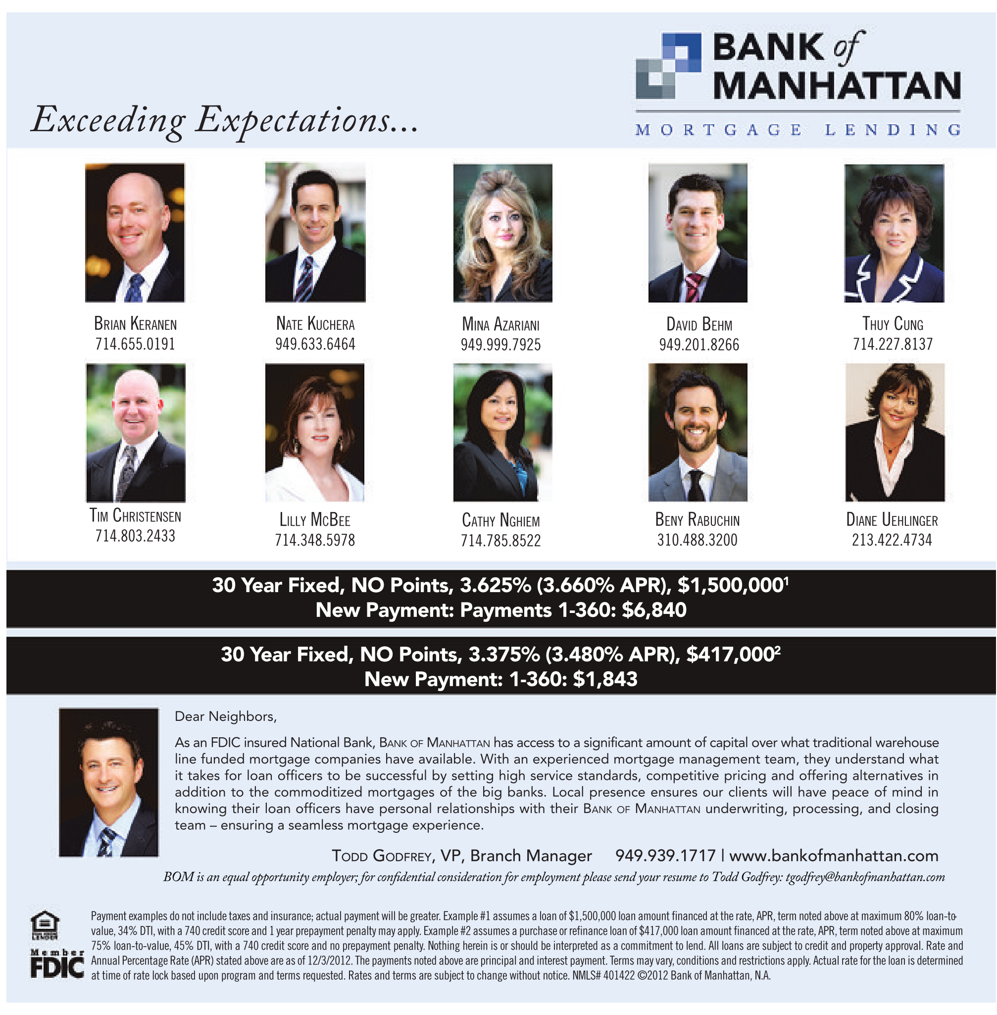 value, 34% DTI, with a740 credit score and 1year prepayment penalty may apply.Example#2assumes apurchase or refinance loan of $417,000 loan amount financed at the rate, APR, termnoted above at maximum 75% loan-to-value, 45% DTI, witha740 credit score and no prepayment penalty.Nothing herein is or should be interpreted as acommitment to lend. All loans are subject to credit and property approval. Rate and Annual Percentage Rate (APR) stated above are as of 12/3/2012. The payments noted above are principal and interest payment. Terms may vary,conditions and restrictions apply.Actual rate for the loan is determined at time of ratelock based upon program and terms requested. Rates and terms aresubject to change without notice. NMLS# 401422 ©2012 Bank of Manhattan, N.A.