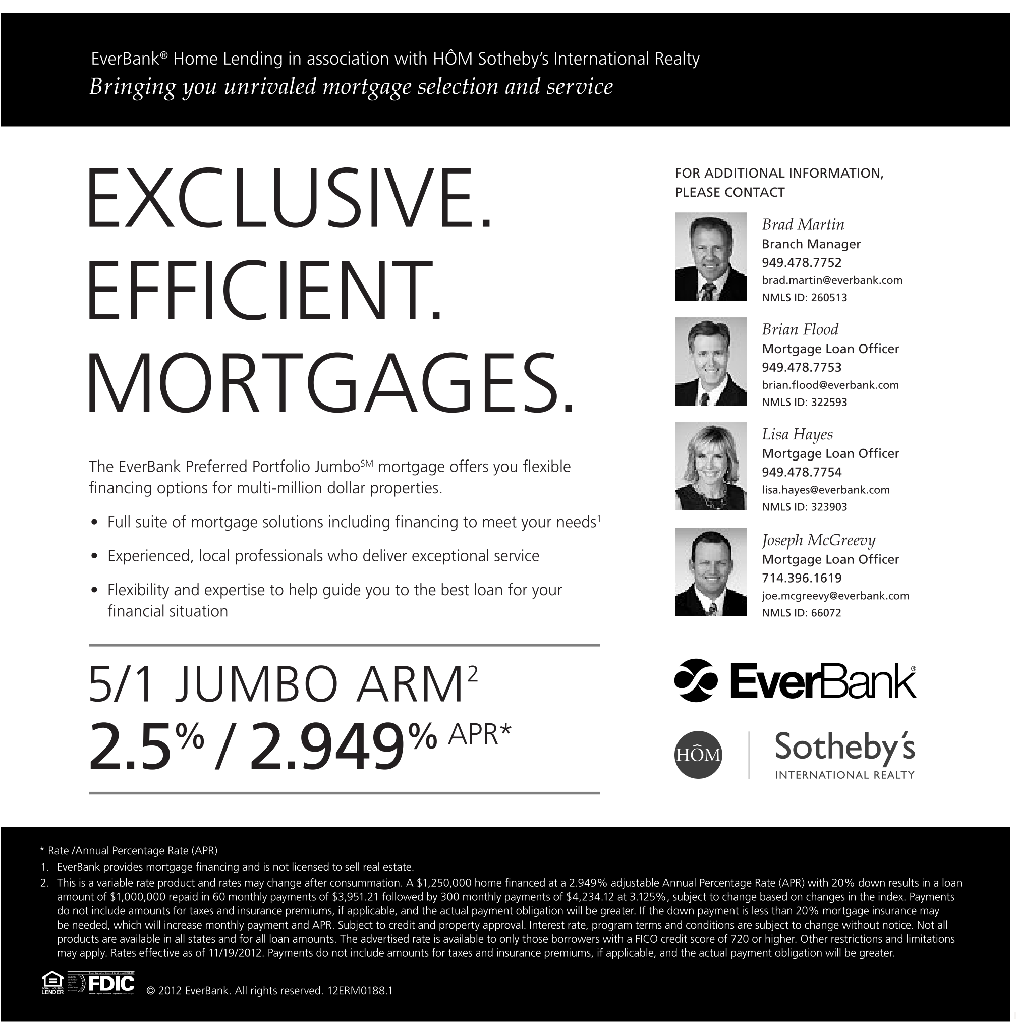 * Rate /Annual Percentage Rate (APR) 1. EverBank provides mortgage financing and is not licensed to sell real estate. 2. this is a variable rate product and rates may change after consummation. A $1,250,000 home financed at a 2.949% adjustable Annual Percentage Rate (APR) with 20% down results in a loan amount of $1,000,000 repaid in 60 monthly payments of $3,951.21 followed by 300 monthly payments of $4,234.12 at 3.125%, subject to change based on changes in the index. Payments do not include amounts for taxes and insurance premiums, if applicable, and the actual payment obligation will be greater. If the down payment is less than 20% mortgage insurance may be needed, which will increase monthly payment and APR. Subject to credit and property approval. Interest rate, program terms and conditions are subject to change without notice. not all products are available in all states and for all loan amounts. the advertised rate is available to only those borrowers with a fIco credit score of 720 or higher. other restrictions and limitations may apply. Rates effective as of 11/19/2012. Payments do not include amounts for taxes and insurance premiums, if applicable, and the actual payment obligation will be greater.
