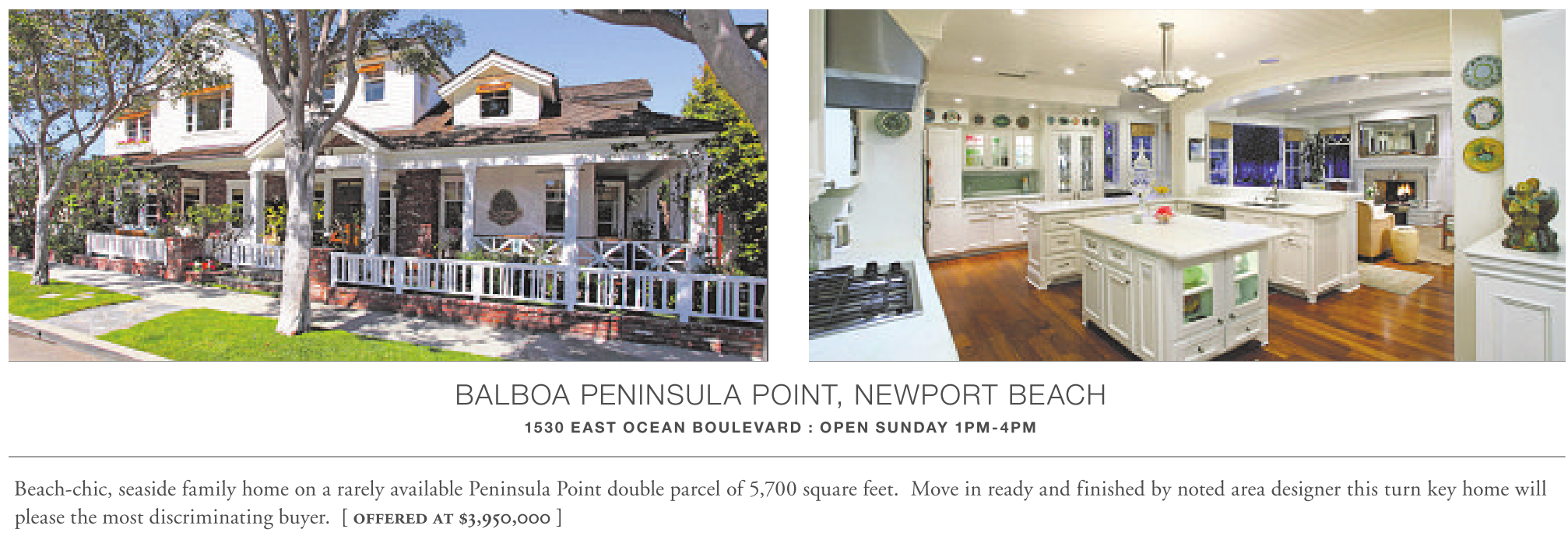 BALBOA PENINSULA POINT, NEWPORT BEACH 1530 EAST OCEAN BOULEVARD : OPEN SUNDAY 1PM-4PM Beach-chic, seaside family home on a rarely available Peninsula Point double parcel of 5,700 square feet. Move in ready and finished by noted area designer this turn key home will please the most discriminating buyer. [ offered at $3,950,000 ] See also