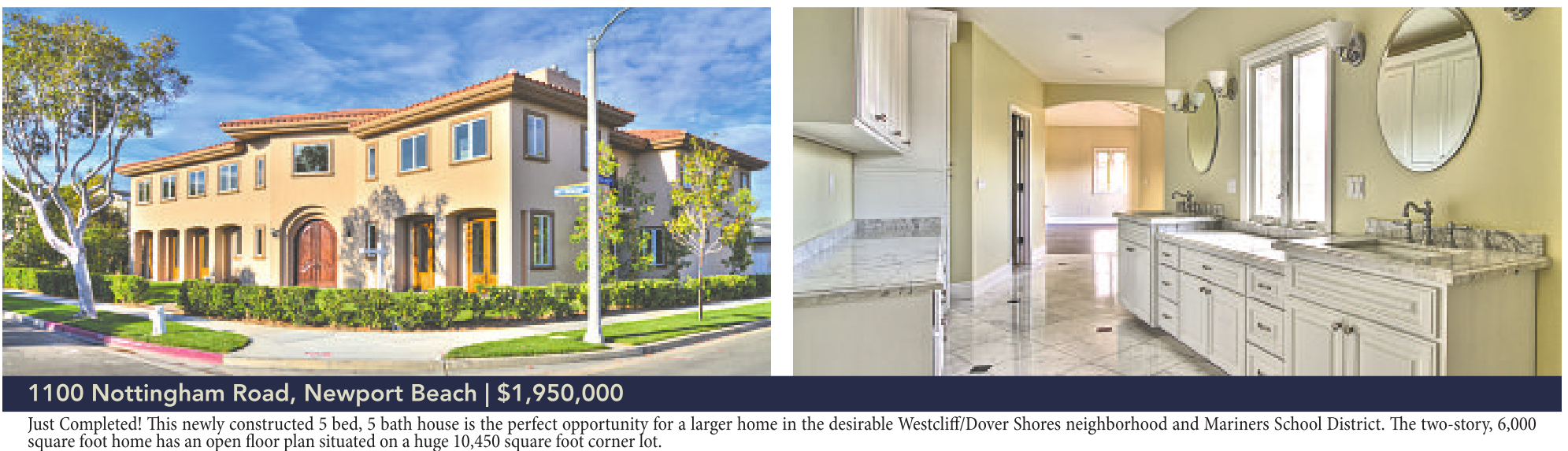 1100 Nottingham Road, Newport Beach | $1,950,000 Just Completed! This newly constructed 5 bed, 5 bath house is the perfect opportunity for a larger home in the desirable Westcliff/Dover Shores neighborhood and Mariners School District. The two-story, 6,000 square foot home hasanopenfloorplansituatedonahuge10,450 square foot corner lot.