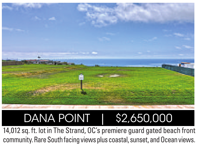 14,012 sq.ft. lotinThe Strand,OC’spremiereguard gatedbeach front community. Rare Southfacingviews plus coastal, sunset,and Oceanviews.