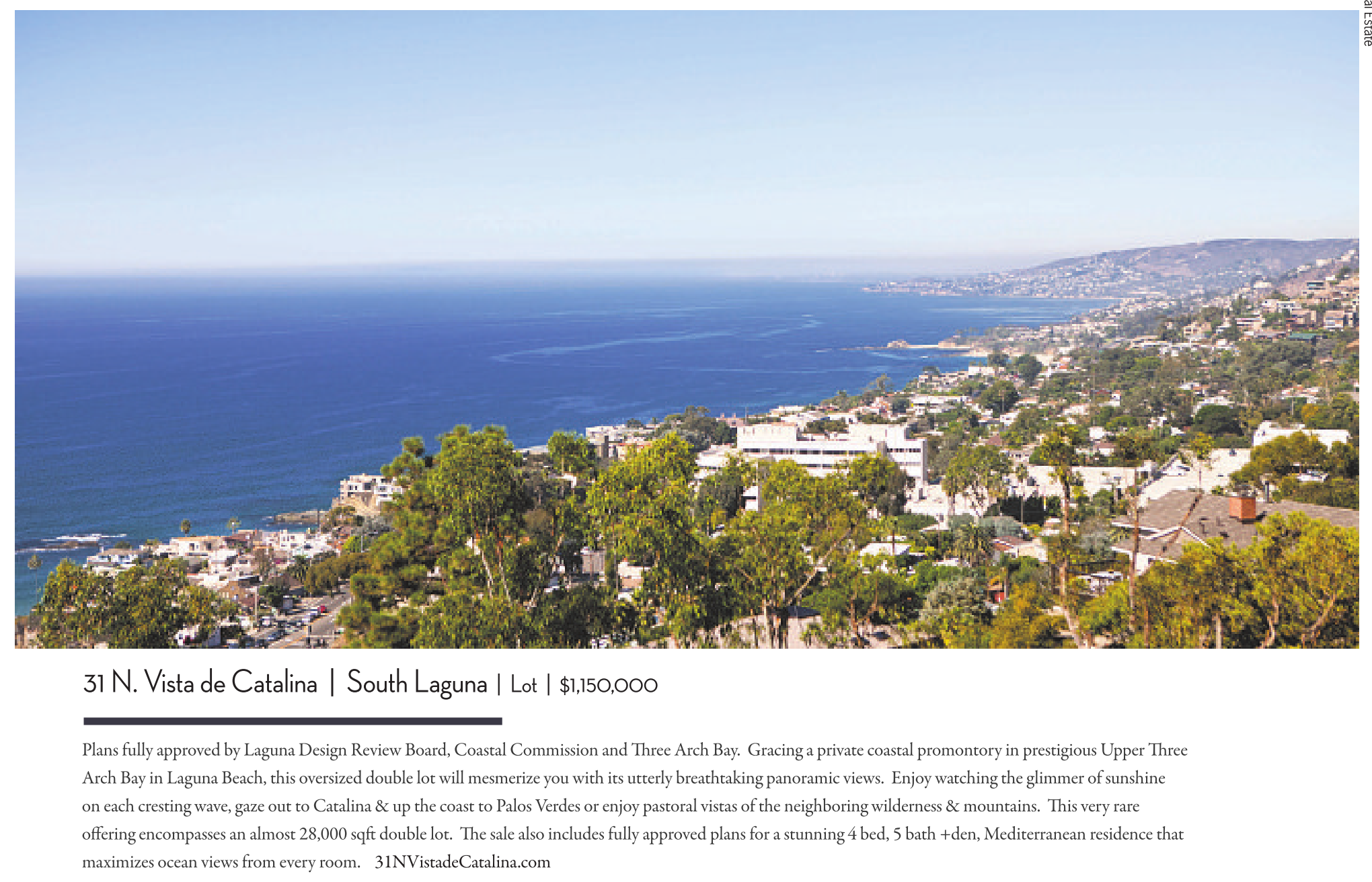 Plansfullyapproved by Laguna DesignReviewBoard, Coastal Commission and Three ArchBay. Gracing aprivate coastal promontoryinprestigious UpperThree ArchBay in Laguna Beach, this oversizeddouble lot willmesmerize you withits utterlybreathtaking panoramic views. Enjoy watching theglimmer of sunshine on each cresting wave,gazeout to Catalina &upthe coast to Palos Verdes or enjoypastoralvistasofthe neighboring wilderness &mountains. This very rare offering encompasses an almost28,000 sqft double lot. The sale also includes fullyapproved plansfor astunning 4bed,5bath+den, Mediterranean residence that maximizes ocean viewsfromevery room. 31NVistadeCatalina.com