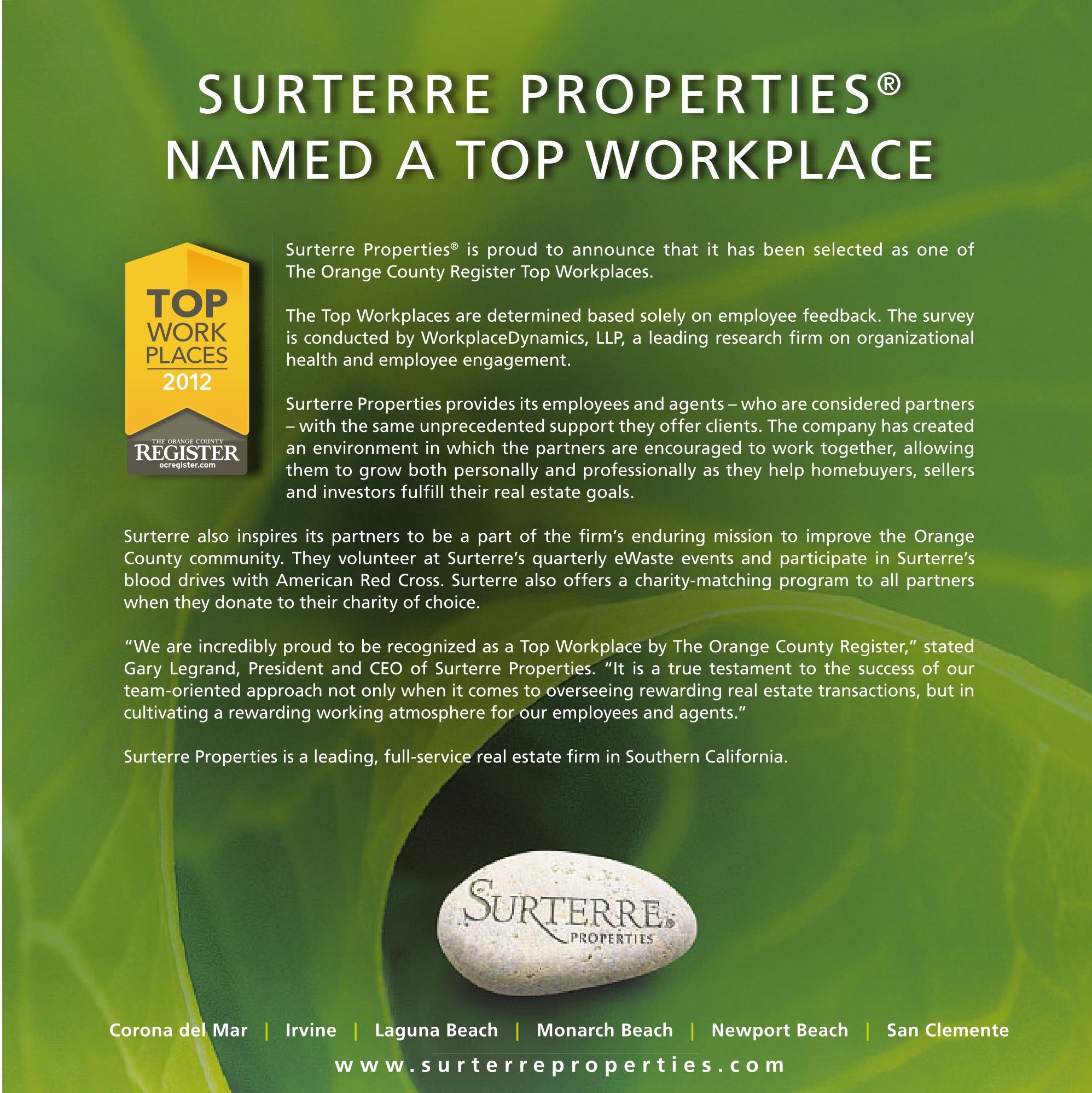 “We are incredibly proud to be recognized as a Top Workplace by The Orange County Register,” stated Gary Legrand, President and CEO of Surterre Properties. “It is a true testament to the success of our team-oriented approach not only when it comes to overseeing rewarding real estate transactions, but in cultivating a rewarding working atmosphere for our employees and agents.”
