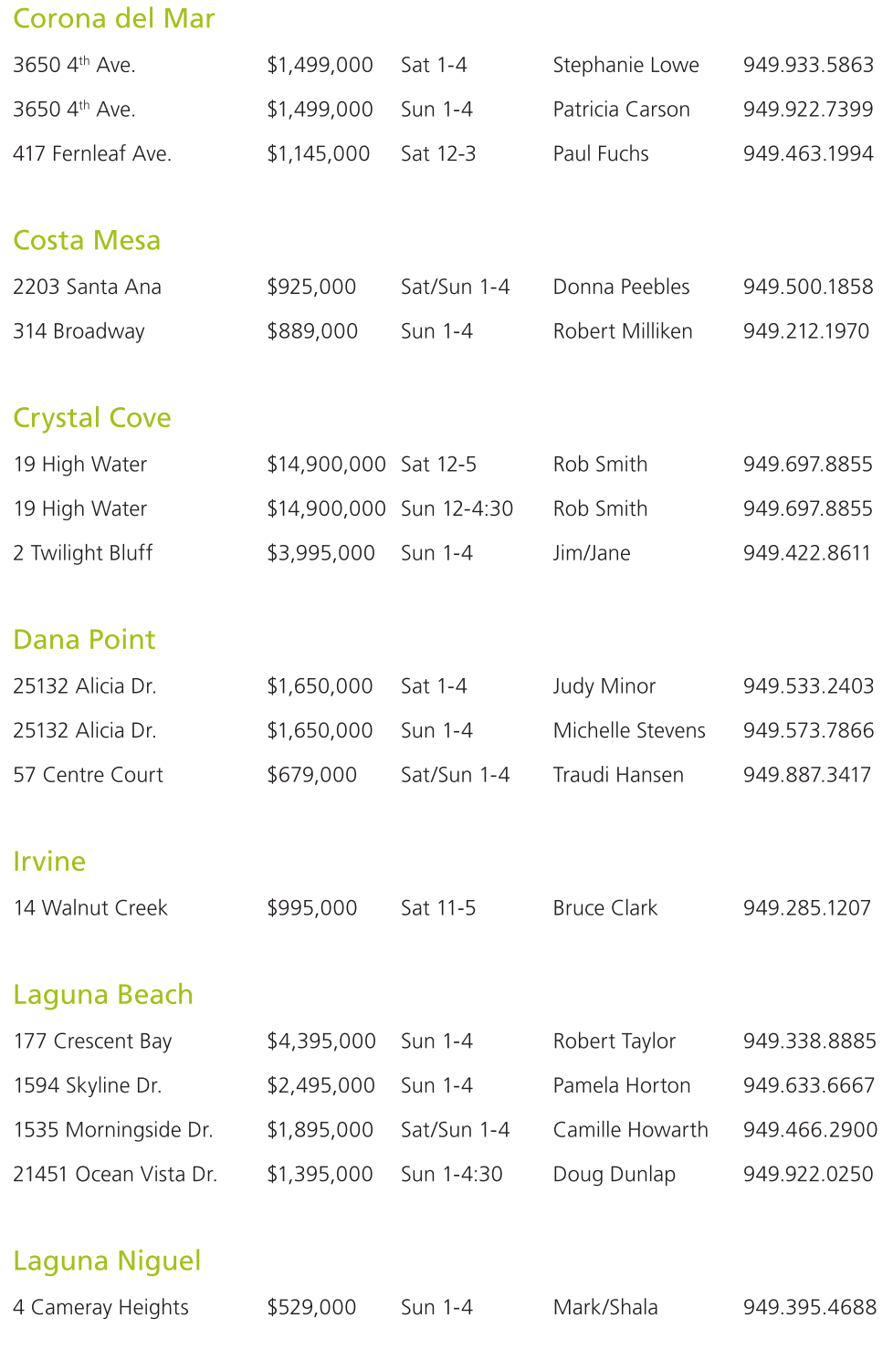3650 4 th Ave. $1,499,000 Sun 1-4 Patricia Carson 949.922.7399 417 Fernleaf Ave. $1,145,000 Sat 12-3 Paul Fuchs 949.463.1994