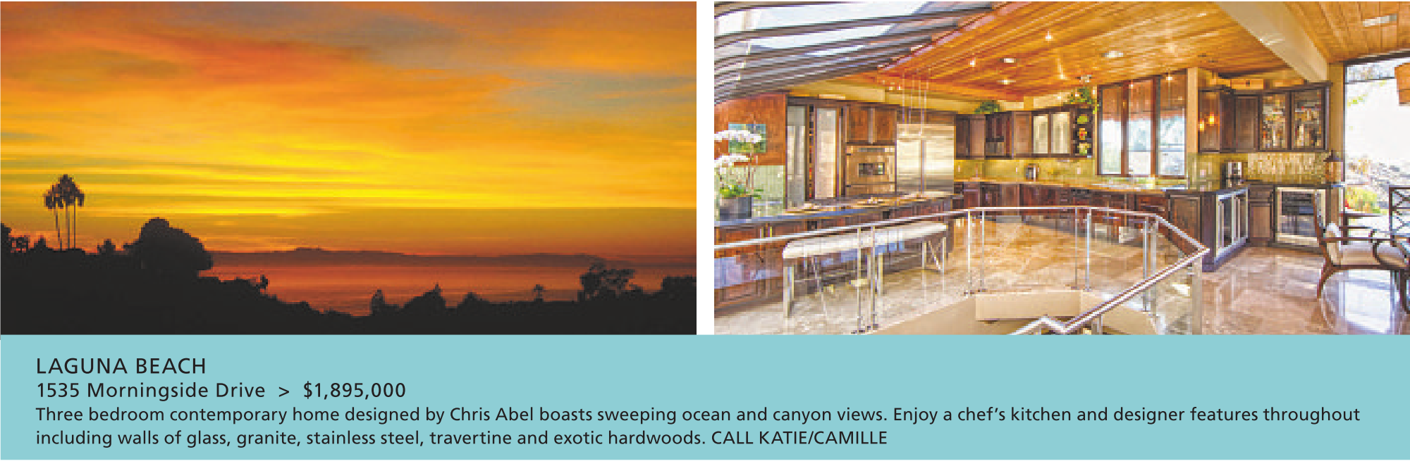 Three bedroom contemporary home designed by Chris Abel boasts sweeping ocean and canyon views. Enjoy a chef’s kitchen and designer features throughout including walls of glass, granite, stainless steel, travertine and exotic hardwoods. CALL KATIE/CAMILLE