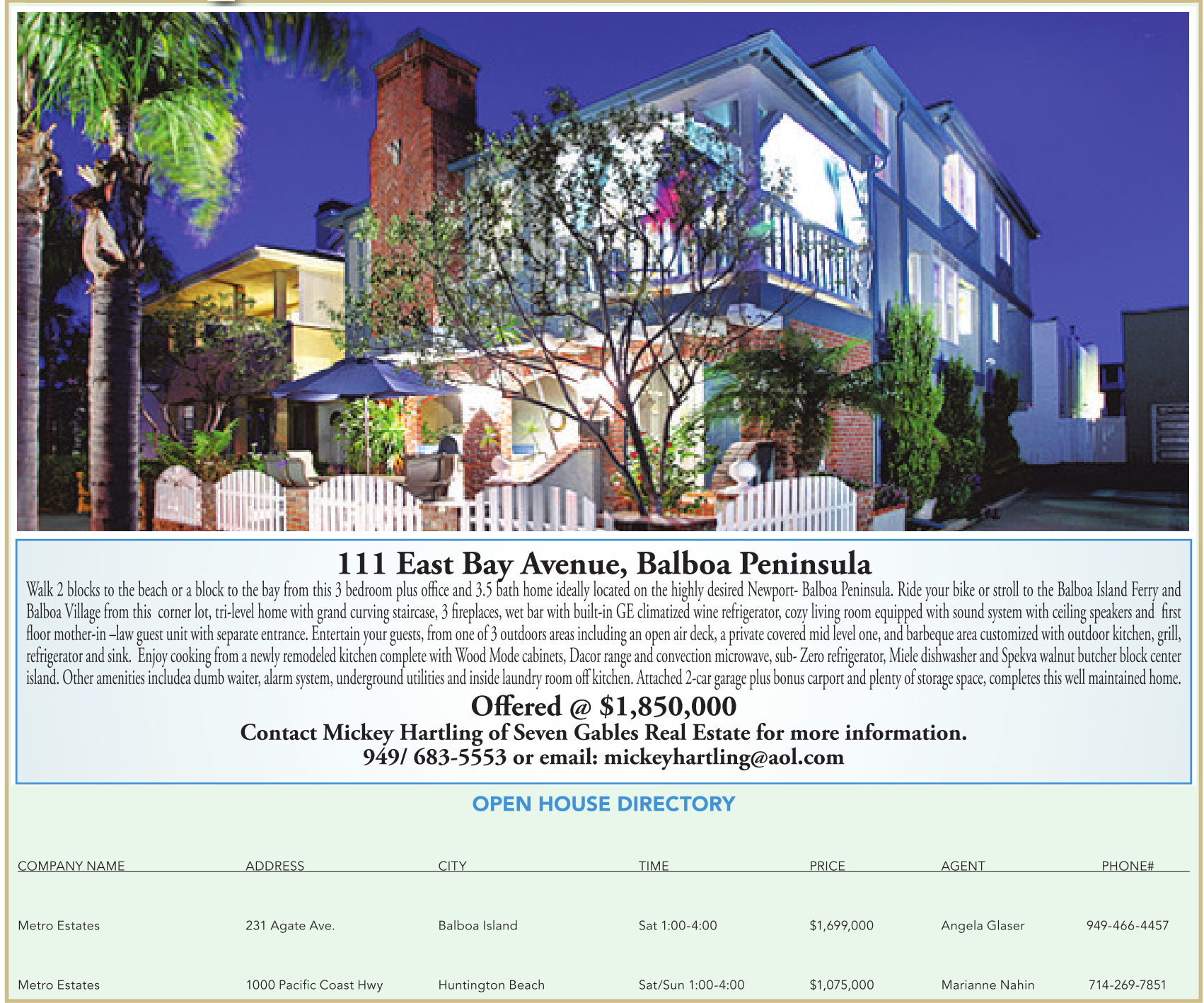 111 East Bay Avenue, Balboa Peninsula Walk 2blocks to the beach or ablock to the bay from this 3bedroom plus office and 3.5 bath home ideally located on the highly desired Newport- Balboa Peninsula. Ride your bike or stroll to the Balboa Island Ferry and Balboa Village from this corner lot, tri-level home with grand curving staircase, 3fireplaces, wet bar with built-in GE climatized wine refrigerator, cozy living room equipped with sound system with ceiling speakers and first floor mother-in –law guest unit with separate entrance. Entertain your guests, from one of 3outdoors areas including an open air deck, aprivate coveredmid level one, and barbeque area customized with outdoor kitchen, grill, refrigerator and sink. Enjoycooking from anewly remodeled kitchen complete with Wood Mode cabinets, Dacor range and convection microwave, sub- Zero refrigerator,Miele dishwasher and Spekvawalnut butcher block center island.Other amenities includea dumb waiter,alarm system, underground utilities and inside laundryroom off kitchen. Attached 2-car garage plus bonus carportand plenty of storage space, completes this well maintained home. Offered @ $1,850,000 Contact Mickey Hartling of Seven Gables Real Estate for more information. 949/ 683-5553 or email: mickeyhartling@aol.com OPEN HOUSE DIRECTORY COMPANY NAME ADDRESS CITY TIME PRICE AGENT PHONE# Metro Estates 231 Agate Ave. Balboa Island Sat 1:00-4:00 $1,699,000 Angela Glaser 949-466-4457 Metro Estates 1000 Pacific Coast Hwy Huntington Beach Sat/Sun 1:00-4:00 $1,075,000 Marianne Nahin 714-269-7851