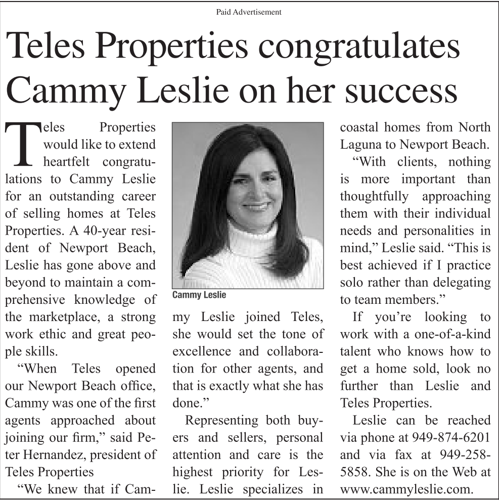 Teles Properties would like to extend heartfelt congratulations to Cammy Leslie for an outstanding career of selling homes at Teles Properties. A 40-year resident of Newport Beach, Leslie has gone above and beyond to maintain a comprehensive knowledge of the marketplace, a strong work ethic and great people skills. “When Teles opened our Newport Beach office, Cammy was one of the first agents approached about joining our firm,” said Peter Hernandez, president of Teles Properties “We knew that if Cam- Paid Advertisement Teles Properties congratulates Cammy Leslie on her success Cammy Leslie my Leslie joined Teles, she would set the tone of excellence and collaboration for other agents, and that is exactly what she has done.” Representing both buyers and sellers, personal attention and care is the highest priority for Leslie. Leslie specializes in coastal homes from North Laguna to Newport Beach. “With clients, nothing is more important than thoughtfully approaching them with their individual needs and personalities in mind,” Leslie said. “This is best achieved if I practice solo rather than delegating to team members.” If you’re looking to work with a one-of-a-kind talent who knows how to get a home sold, look no further than Leslie and Teles Properties. Leslie can be reached via phone at 949-874-6201 and via fax at 949-258- 5858. She is on the Web at www.cammyleslie.com. See also