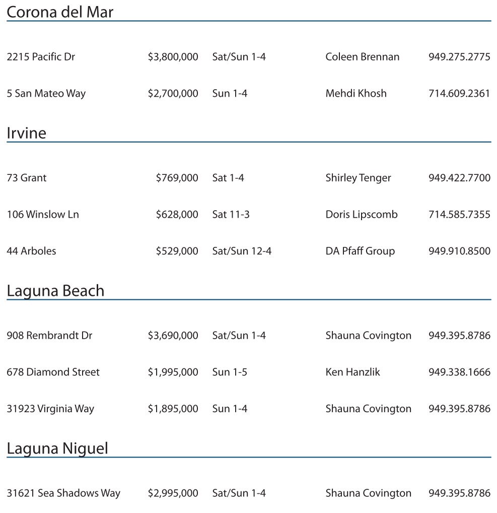 Corona del Mar 2215 Pacific Dr $3,800,000 Sat/Sun 1-4 Coleen Brennan 949.275.2775 5San MateoWay $2,700,000 Sun 1-4 Mehdi Khosh 714.609.2361 Irvine 73 Grant $769,000 Sat1-4 Shirley Tenger 949.422.7700 106 WinslowLn $628,000 Sat11-3 DorisLipscomb 714.585.7355 44 Arboles $529,000 Sat/Sun 12-4 DA Pfaff Group 949.910.8500 Laguna Beach 908 Rembrandt Dr $3,690,000 Sat/Sun 1-4 Shauna Covington 949.395.8786 678 Diamond Street $1,995,000 Sun 1-5 Ken Hanzlik 949.338.1666 31923 Virginia Way $1,895,000 Sun 1-4 Shauna Covington 949.395.8786 Laguna Niguel 31621 SeaShadows Way $2,995,000 Sat/Sun 1-4 Shauna Covington 949.395.8786 See also