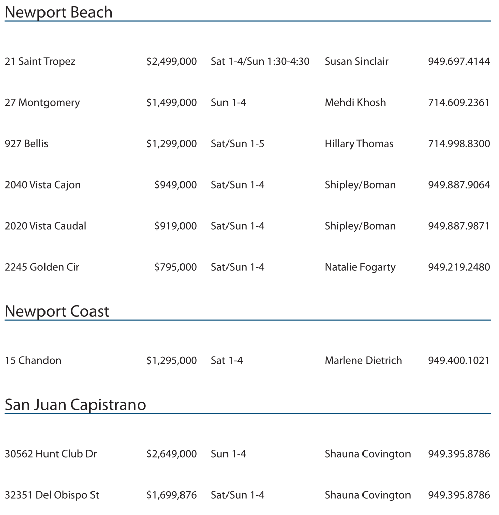 Newport Beach 21 SaintTropez $2,499,000 Sat1-4/Sun 1:30-4:30 Susan Sinclair 949.697.4144 27 Montgomery $1,499,000 Sun 1-4 Mehdi Khosh 714.609.2361 927 Bellis $1,299,000 Sat/Sun 1-5 HillaryThomas 714.998.8300 2040 Vista Cajon $949,000 Sat/Sun 1-4 Shipley/Boman 949.887.9064 2020 Vista Caudal $919,000 Sat/Sun 1-4 Shipley/Boman 949.887.9871 2245 Golden Cir $795,000 Sat/Sun 1-4 Natalie Fogarty 949.219.2480 Newport Coast 15 Chandon $1,295,000 Sat1-4 Marlene Dietrich 949.400.1021 San Juan Capistrano 30562 HuntClub Dr $2,649,000 Sun 1-4 Shauna Covington 949.395.8786 32351 DelObispo St $1,699,876 Sat/Sun 1-4 Shauna Covington 949.395.8786 See also