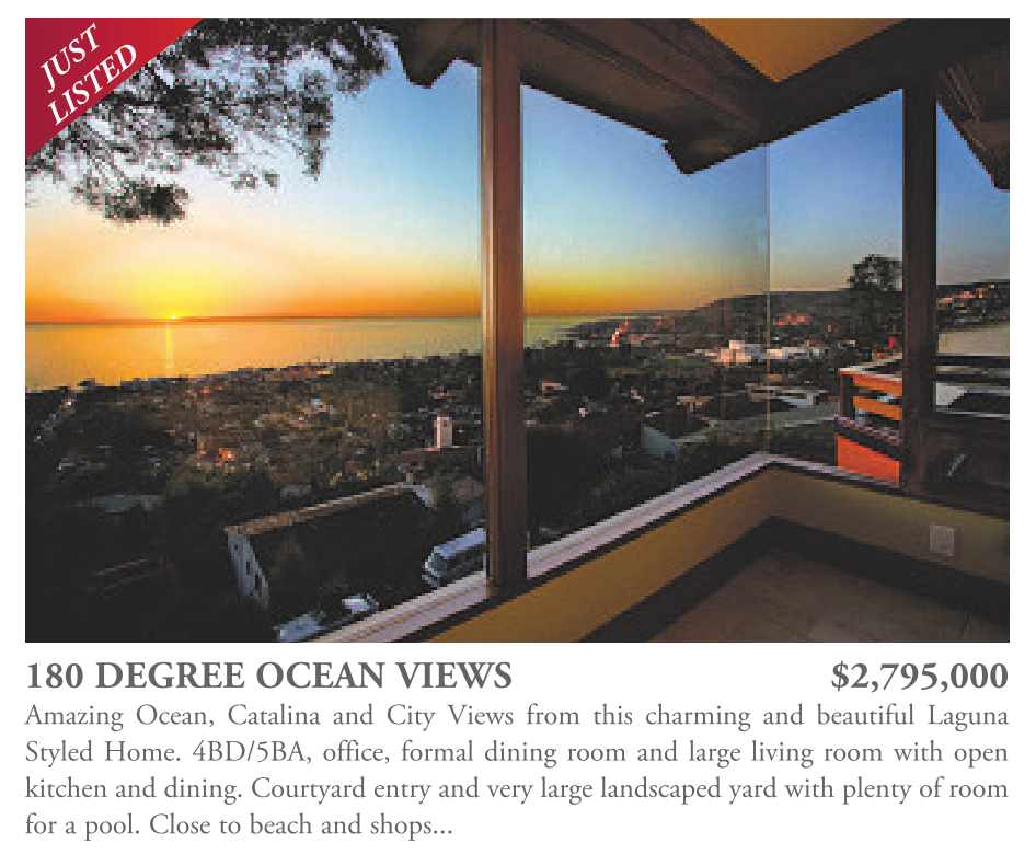 180 DEGREE OCEAN VIEWS $2,795,000 Amazing Ocean, Catalina and City Views from this charming and beautiful Laguna Styled Home. 4BD/5BA, office, formal dining room and large living room with open kitchen and dining. Courtyard entry and very large landscaped yard with plenty of room for a pool. Close to beach and shops...