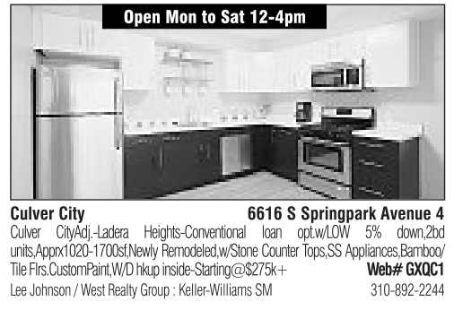 Culver CityAdj.-Ladera Heights-Conventional loan opt.w/LOW 5% down,2bd units,Apprx1020-1700sf,Newly Remodeled,w/Stone Counter Tops,SS Appliances,Bamboo/ Tile Flrs.CustomPaint,W/D hkup inside-Starting@$275k+ Web# GXQC1