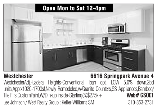 WestchesterAdj.-Ladera Heights-Conventional loan opt. LOW 5.0% down,2bd units,Apprx1020-1700sf,Newly Remodeled,w/Granite Counters,SS Appliances,Bamboo/ Tile Flrs.CustomPaint,W/D hkup inside-Starting@$275k+ Web# GSOE1