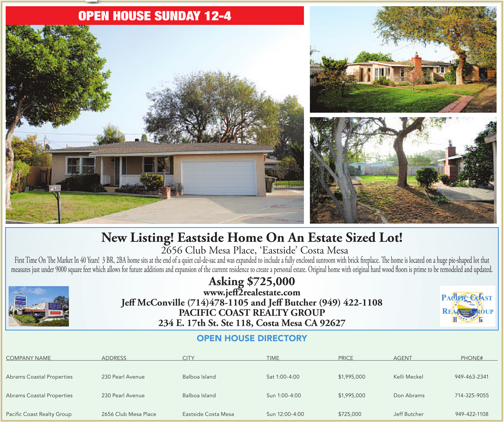 OPEN HOUSE SUNDAY 12-4 New Listing! Eastside Home On An Estate Sized Lot! 2656 Club Mesa Place, ‘Eastside’ Costa Mesa First Time On The Market In 40 Years! 3BR, 2BA home sits at the end of aquiet cul-de-sac and was expanded to include afully enclosed sunroom with brick fireplace. The home is located on ahuge pie-shaped lot that measures just under 9000 squarefeet which allows for futureadditions and expansion of the current residence to create apersonal estate. Original home with original hard wood floors is prime to be remodeled and updated. Asking $725,000 www.jeff2realestate.com Jeff McConville (714)478-1105 and Jeff Butcher (949) 422-1108 PACIFIC COAST REALTY GROUP 234 E. 17th St. Ste 118, Costa Mesa CA 92627 OPEN HOUSE DIRECTORY PACIFIC COAST REALTY GROUP COMPANY NAME ADDRESS CITY TIME PRICE AGENT PHONE# Abrams Coastal Properties 230 Pearl Avenue Balboa Island Sat 1:00-4:00 $1,995,000 Kelli Meckel 949-463-2341 Abrams Coastal Properties 230 Pearl Avenue Balboa Island Sun 1:00-4:00 $1,995,000 Don Abrams 714-325-9055 Pacific Coast Realty Group 2656 Club Mesa Place Eastside Costa Mesa Sun 12:00-4:00 $725,000 Jeff Butcher 949-422-1108