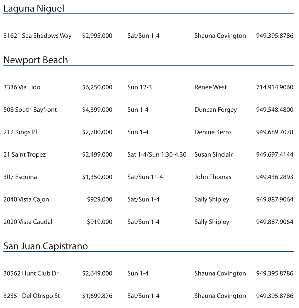 32351 DelObispo St $1,699,876 Sat/Sun 1-4 Shauna Covington 949.395.8786