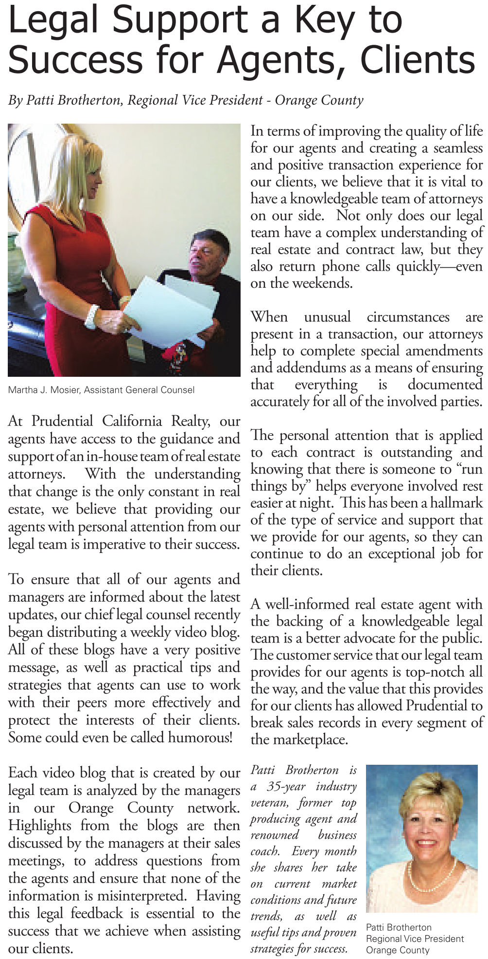 A well-informed real estate agent with the backing of a knowledgeable legal team is a better advocate for the public. The customer service that our legal team provides for our agents is top-notch all the way, and the value that this provides for our clients has allowed Prudential to break sales records in every segment of the marketplace.