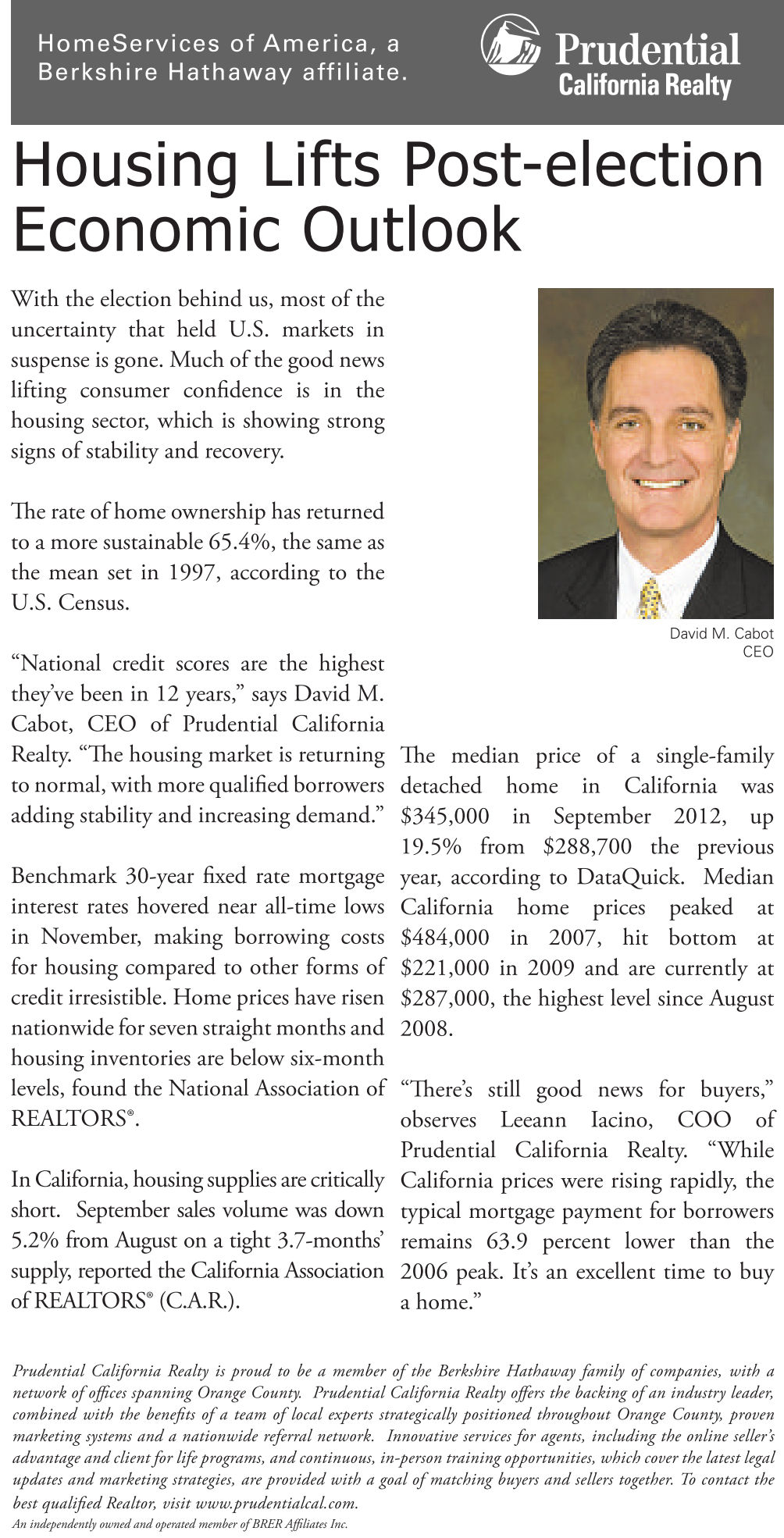 The rate of home ownership has returned to a more sustainable 65.4%, the same as the mean set in 1997, according to the U.S. Census. “National credit scores are the highest they’ve been in 12 years,” says David M. Cabot, CEO of Prudential California Realty. “The housing market is returning to normal, with more qualified borrowers adding stability and increasing demand.” Benchmark 30-year fixed rate mortgage interest rates hovered near all-time lows in November, making borrowing costs for housing compared to other forms of credit irresistible. Home prices have risen nationwide for seven straight months and housing inventories are below six-month levels, found the National Association of REALTORS®. In California, housing supplies arecritically short. September sales volume was down 5.2% from August on a tight 3.7-months’ supply, reported the California Association of REALTORS® (C.A.R.).