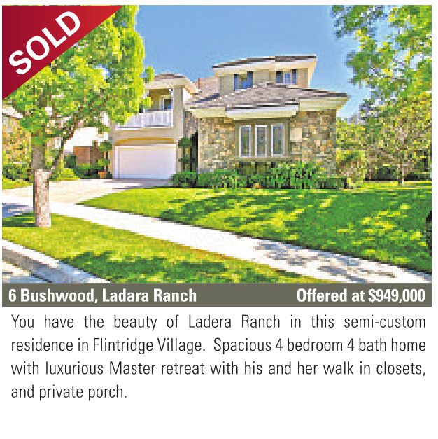 6Bushwood, Ladara Ranch Offered at $949,000 You have the beauty of Ladera Ranch in this semi-custom residence in Flintridge Village. Spacious 4bedroom 4bath home with luxurious Master retreat with his and her walk in closets, and private porch.
