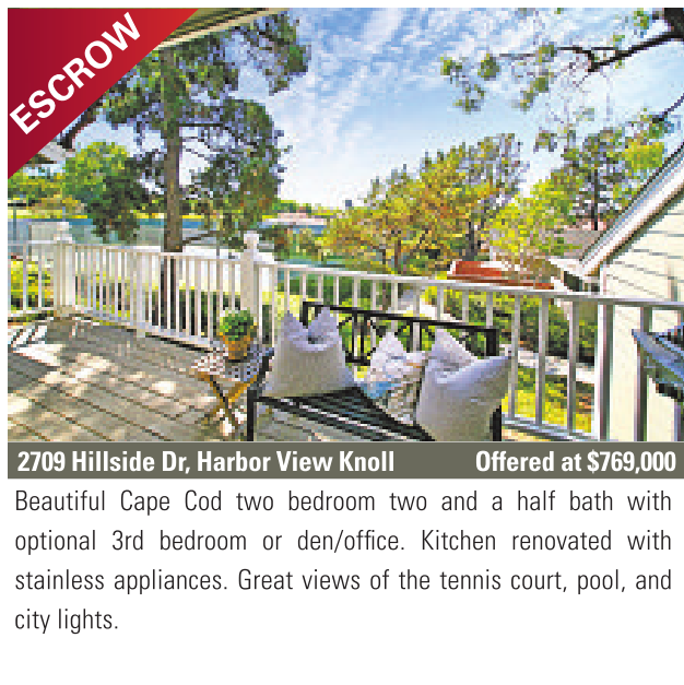2709 Hillside Dr,Harbor View Knoll Offered at $769,000 Beautiful Cape Cod two bedroom two and a half bath with optional 3rd bedroom or den/office. Kitchen renovated with stainless appliances. Great views of the tennis court, pool, and city lights.