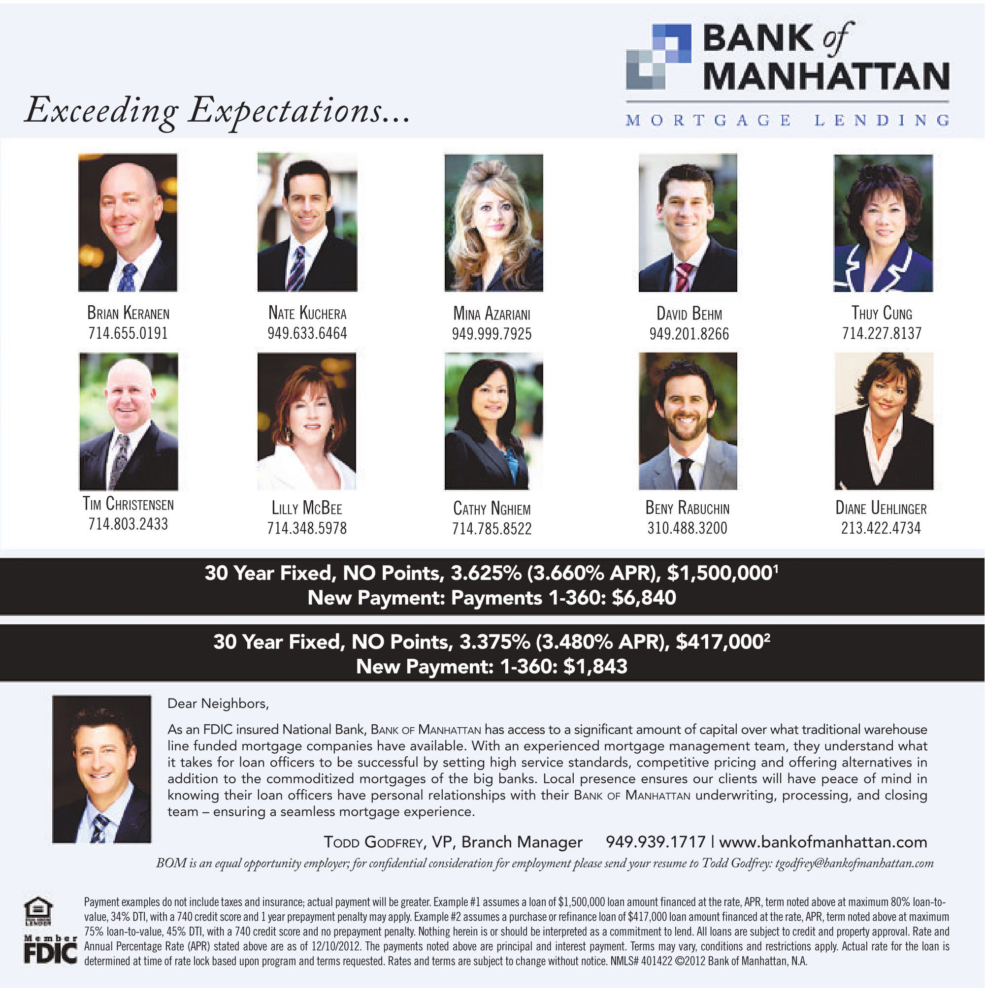 Payment examples do not include taxes and insurance; actual payment will be greater.Example #1 assumes aloan of $1,500,000 loan amount financed at the rate, APR, term noted above at maximum 80% loan-tovalue, 34% DTI, with a740 credit score and 1year prepayment penalty may apply.Example #2 assumes apurchase or refinance loan of $417,000 loan amount financed at the rate, APR, term noted above at maximum 75% loan-to-value, 45% DTI, with a740 credit score and no prepayment penalty.Nothing herein is or should be interpreted as acommitment to lend. All loans are subject to credit and property approval. Rate and Annual Percentage Rate (APR) stated above are as of 12/10/2012. The payments noted above are principal and interest payment. Terms may vary, conditions and restrictions apply. Actual rate for the loan is determined at time of rate lock based upon program and terms requested. Rates and terms are subject to change without notice. NMLS# 401422 ©2012 Bank of Manhattan, N.A.