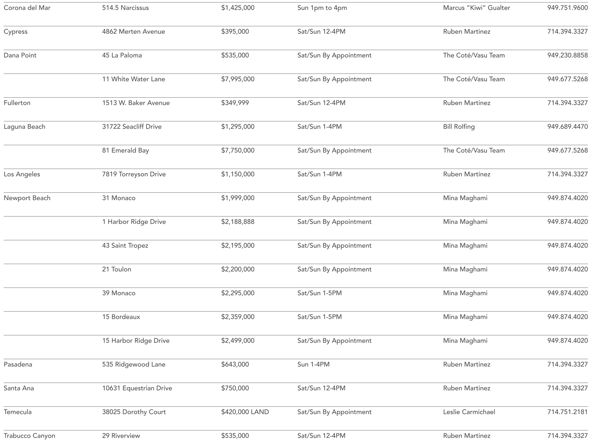 Corona del Mar 514.5 Narcissus $1,425,000 Sun 1pm to 4pm Marcus “Kiwi” Gualter 949.751.9600