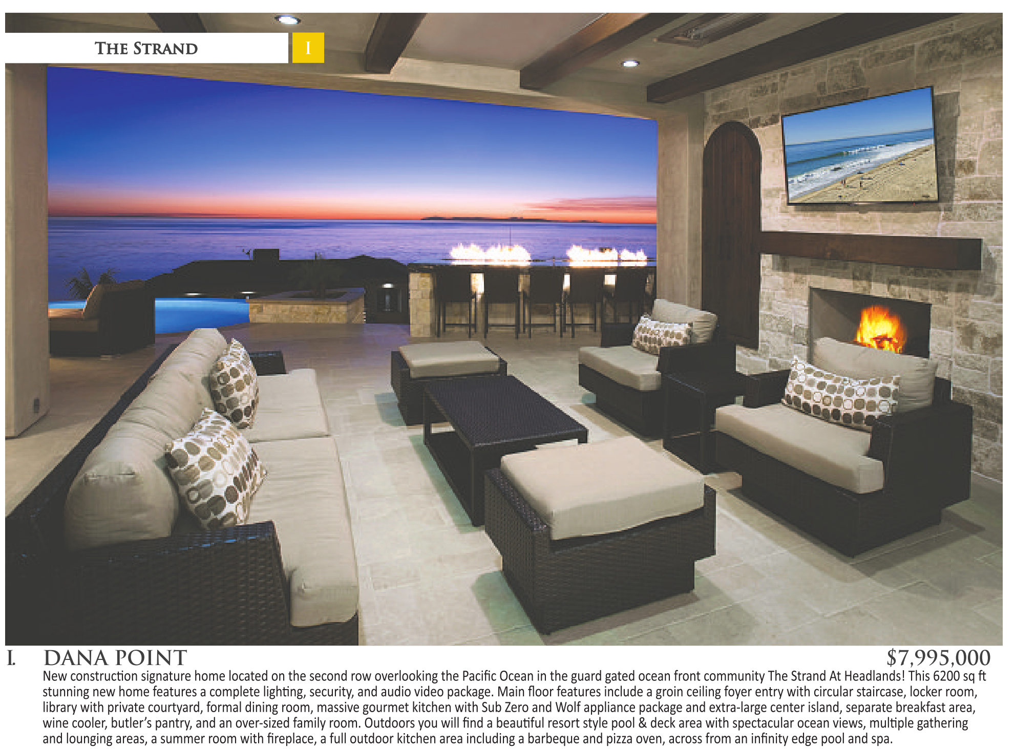 New construc on signature home located on the second row overlooking the Pacific Ocean in the guard gated ocean front community The Strand At Headlands! This 6200 sq stunning new home features a complete ligh ng, security, and audio video package. Main floor features include a groin ceiling foyer entry with circular staircase, locker room, library with private courtyard, formal dining room, massive gourmet kitchen with Sub Zero and Wolf appliance package and extra-large center island, separate breakfast area, wine cooler, butler’s pantry, and an over-sized family room. Outdoors you will find a beau ful resort style pool & deck area with spectacular ocean views, mul ple gathering and lounging areas, a summer room with fireplace, a full outdoor kitchen area including a barbeque and pizza oven, across from an infinity edge pool and spa.
