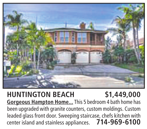 HUNTINGTON BEACH $1,449,000 GorgeousHamptonHome... This 5bedroom4bathhome has beenupgraded with granite counters, custommoldings.Custom leaded glassfrontdoor. Sweepingstaircase,chefskitchen with centerislandand stainlessappliances. 714-969-6100