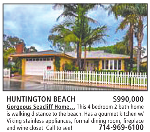 HUNTINGTON BEACH $990,000 Gorgeous Seacliff Home… This 4bedroom 2bathhome is walkingdistancetothe beach.Has agourmet kitchen w/ Viking stainless appliances, formal dining room, fireplace andwinecloset. Call to see! 714-969-6100