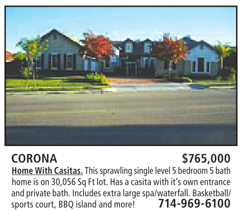 CORONA $765,000 Home With Casitas. This sprawlingsinglelevel 5bedroom5bath homeison30,056 Sq Ft lot. Hasacasitawithit’sown entrance andprivatebath. Includes extralarge spa/waterfall. Basketball/ sports court, BBQislandand more! 714-969-6100