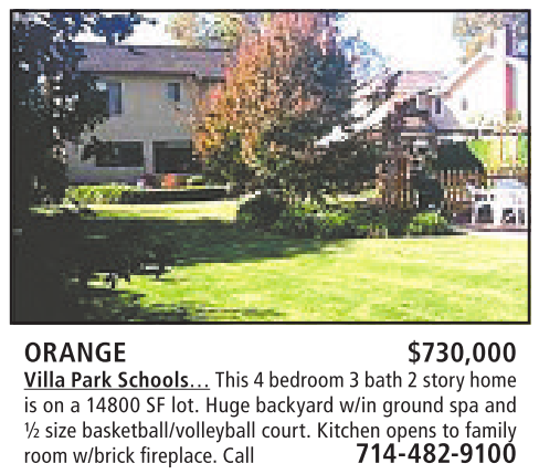 ORANGE $730,000 Villa Park Schools…This 4bedroom 3bath2story home is on a14800 SF lot. Huge backyard w/in ground spa and ½size basketball/volleyball court. Kitchen opens to family room w/brick fireplace.Call 714-482-9100