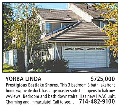 YORBA LINDA $725,000 Prestigious Eastlake Shores. This 3bedroom 3bath lakefront homew/privatedockhas large mastersuitethatopens to balcony w/views. Bedroom and bath downstairs. Has new HVAC unit. Charmingand Immaculate!Calltosee… 714-482-9100