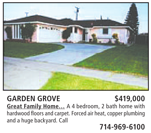 GARDEN GROVE $419,000 Great Family Home… A4bedroom, 2bath home with hardwood floors andcarpet. Forcedair heat,copperplumbing andahugebackyard. Call 714-969-6100