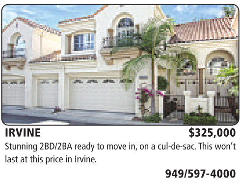 IRVINE $325,000 Stunning 2BD/2BAready to move in, on acul-de-sac. This won’t last at this price in Irvine.