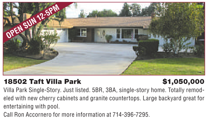18502 Taft Villa Park $1,050,000 Villa Park Single-Story. Just listed. 5BR, 3BA, single-story home. Totally remodeled with new cherry cabinets and granite countertops. Large backyard great for entertaining with pool. Call Ron Accornero formoreinformation at 714-396-7295.