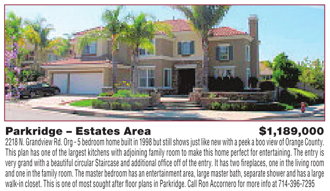 Parkridge – Estates Area $1,189,000 2218 N. Grandview Rd. Org-5bedroomhomebuiltin1998but still showsjustlike newwithapeekaboo view of Orange County. This plan has one of the largest kitchens with adjoining family room tomake this home perfect for entertaining. The entry is very grand with abeautiful circular Staircase and additional office off ofthe entry. It has two fireplaces, one in the living room and oneinthe familyroom. Themaster bedroomhas an entertainmentarea,large master bath,separateshowerand hasalarge walk-incloset. This is oneofmost sought after floorplans in Parkridge.CallRon Accornerofor moreinfoat714-396-7295