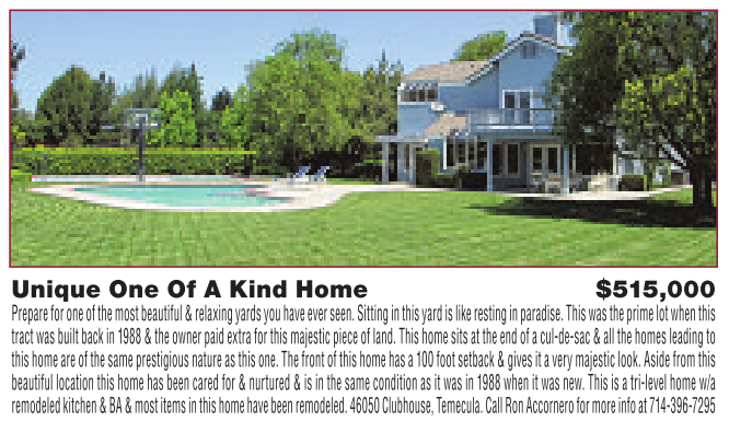 Unique One Of A Kind Home $515,000 Preparefor oneofthe most beautiful&relaxingyards youhave everseen. Sittinginthisyardislike restinginparadise. This wasthe primelot when this tract was built back in 1988 &the owner paid extra for this majestic piece ofland. This home sits at the end of acul-de-sac &all the homes leading to this home areofthe same prestigious nature as this one. Thefront of this home hasa100 foot setback&gives it averymajestic look. Aside from this beautiful location this home has been cared for &nurtured &isinthe same condition as it was in1988 when it was new. This isatri-level home w/a remodeledkitchen &BA&mostitems in this home have beenremodeled. 46050Clubhouse, Temecula.CallRon Accornerofor moreinfoat714-396-7295