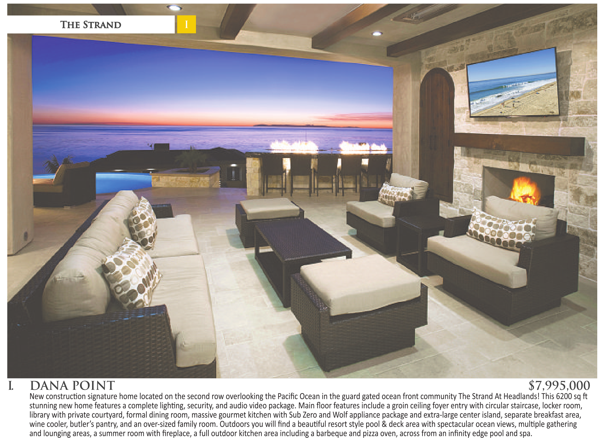 The Strand The Strand I I. DANA POINT $7,995,000 New construc on signature home located on the second row overlooking the Pacific Ocean in the guard gated ocean front community The Strand At Headlands! This 6200 sq stunning new home features a complete ligh ng, security, and audio video package. Main floor features include a groin ceiling foyer entry with circular staircase, locker room, library with private courtyard, formal dining room, massive gourmet kitchen with Sub Zero and Wolf appliance package and extra-large center island, separate breakfast area, wine cooler, butler’s pantry, and an over-sized family room. Outdoors you will find a beau ful resort style pool & deck area with spectacular ocean views, mul ple gathering and lounging areas, a summer room with fireplace, a full outdoor kitchen area including a barbeque and pizza oven, across from an infinity edge pool and spa.