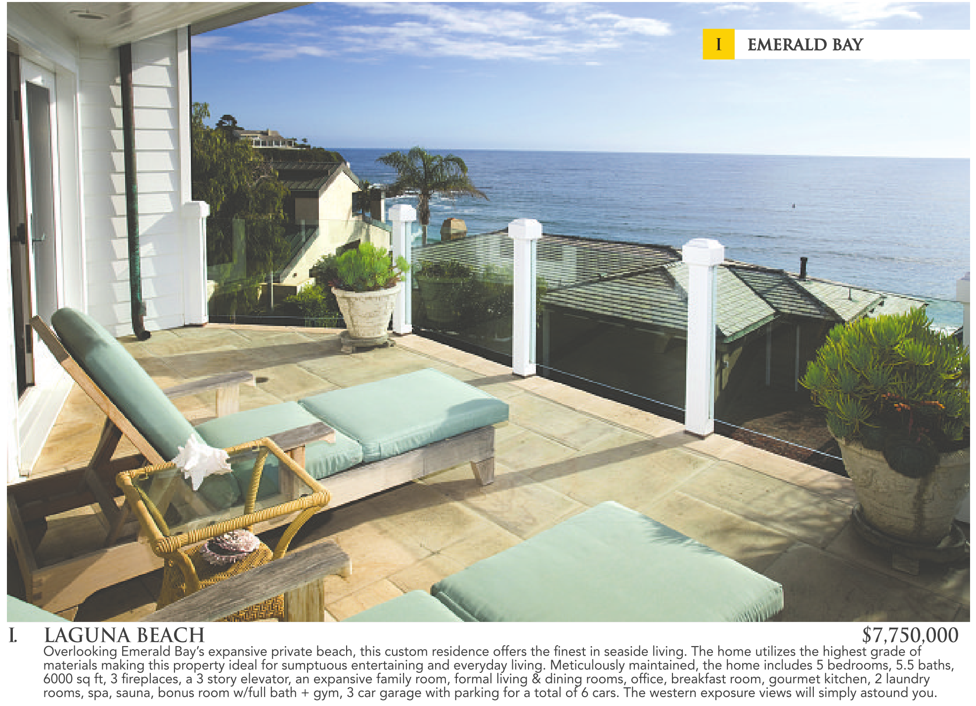 EMERALD BAY EMERALD BAY I. LAGUNA BEACH $7,750,000 Overlooking Emerald Bay’s expansive private beach, this custom residence offers the finest in seaside living. The home utilizes the highest grade of materials making this property ideal for sumptuous entertaining and everyday living. Meticulously maintained, the home includes 5 bedrooms, 5.5 baths, 6000 sq ft, 3 fireplaces, a 3 story elevator, an expansive family room, formal living & dining rooms, office, breakfast room, gourmet kitchen, 2 laundry rooms, spa, sauna, bonus room w/full bath + gym, 3 car garage with parking for a total of 6 cars. The western exposure views will simply astound you. I