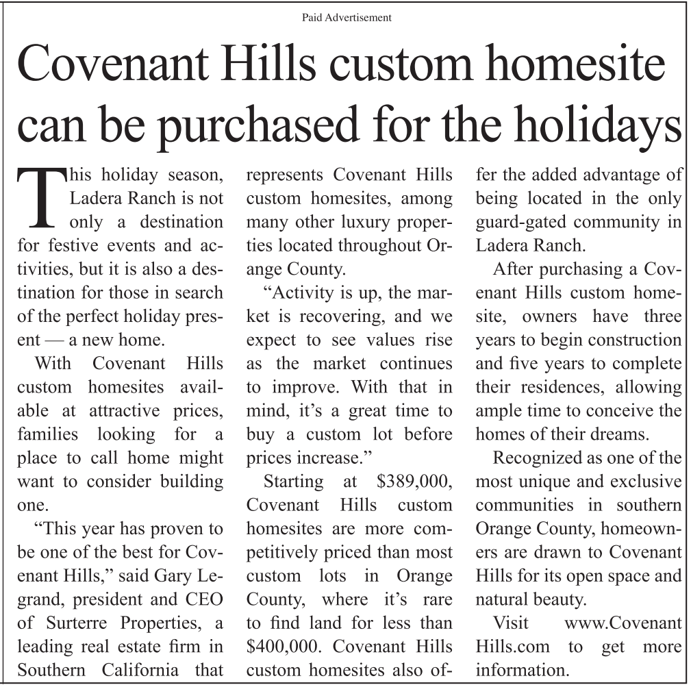 “This year has proven to be one of the best for Covenant Hills,” said Gary Legrand, president and CEO of Surterre Properties, a leading real estate firm in Southern California that